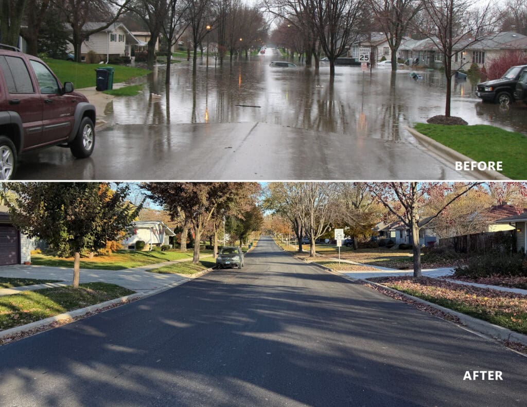 Environmental stewardship was central to the project, which not only improved resiliency and reduced flood risk but also incorporated naturalized features to enhance habitat and water quality. The design ensured that increased storage capacity did not adversely affect downstream areas, and additional improvements included replacing lead water services for impacted homes. Challenges such as installing large-diameter storm sewers through fully developed neighborhoods required innovative solutions, including on-the-fly redesigns and adaptive construction techniques. Value engineering measures, such as replacing oversized manholes with elbows and base-T structures, saved time and costs while maintaining functionality.