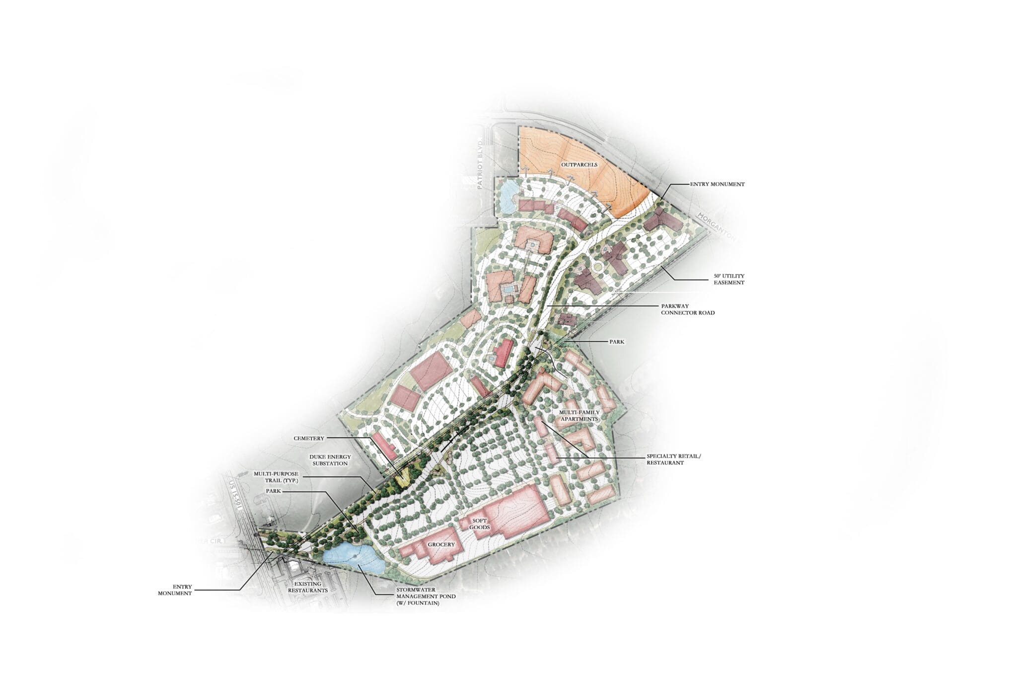 We worked closely with Town officials, planning staff, and the developer to establish flexible zoning that supports a vibrant, mixed-use community. Our master planning efforts positioned the +100-acre site as a central hub linking US Highway 15/501 and Morganton Road, creating a strong spine for future growth.